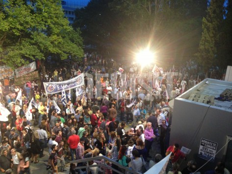 Xιλιάδες κόσος παραμένει στο προαύλιο της ΕΡΤ όπου νωρίτερα έγινε το συλλαλητήριο της ΓΣΕΕ και της ΑΔΕΔΥ σε ένδειξη διαμαρτυρίας για το κλείσιμο της ΕΡΤ.