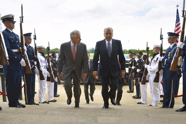 “Ο Υπουργός Άμυνας Chuck Hagel καλοσώρισε τον Έλληνα Υπουργού Άμυνας Δημήτρη Αβραμόπουλου στο Πεντάγωνο. Ο κ. Hagel ευχαρίστησε τον κ. Αβραμόπουλο για τη συνέχιση της φιλοξενίας στην Ελλάδα των ναυτικών αμερικανικών δυνάμεων στη Σούδα που αποτελεί σημείο κλειδί για τους αμερικανικούς στρατηγικούς στόχους στην περιοχή. Η σημασία της έγινε εμφανής κατά τη διάρκεια της επιχείρησης Unified Protector στη Λιβύη”.