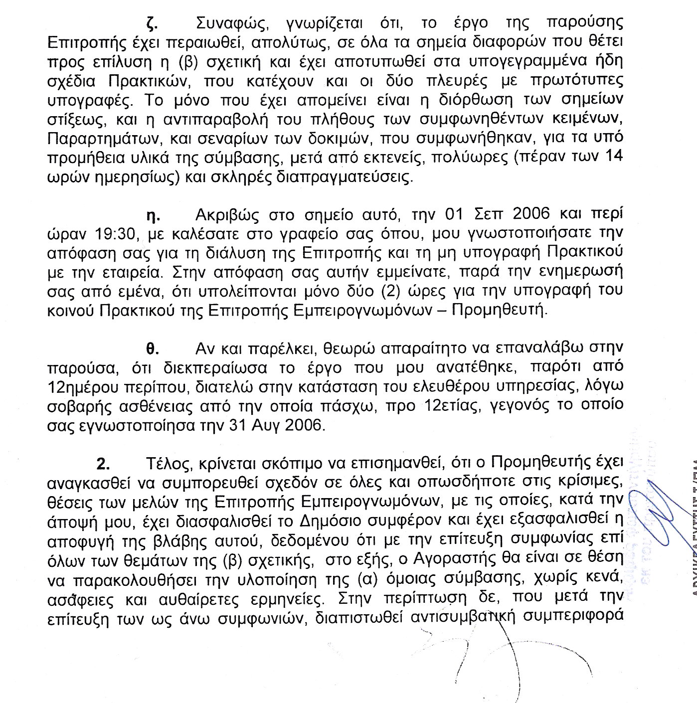 Στη θέση αυτή επέμεινε παρά την επισήμανση του προέδρου της Επιτροπής ότι σε 2 ώρες θα έχει ολοκληρωθεί το έργο της, σε δε αίτημα του προέδρου περί επίδοσης σχετικού εγγράφου με την απόφαση διάλυσης της Επιτροπής και τι θα γίνει με τα έγγραφα που ήδη έχουν υπογραφεί με την Εταιρεία ο κ. Βασιλάκος είπε ότι η διαταγή θα βγεί την Δευτέρα και θα τα παραδώσετε.