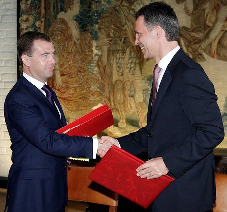 Ο Στόλτενμπεργκ υπέγραψε μια διμερή συμφωνία με τον Ρώσο Πρόεδρο Ντμίτρι Μεντβέντεφ για να επιλύσει τις επί δεκαετίες διασυνοριακές διαφορές αναφορικά με το πετρέλαιο και το φυσικό αέριο της πλούσιας θάλασσας του Μπάρεντς. Οι σχέσεις τους βελτιώθηκαν ακόμη περισσότερο το 2012 με τη δημιουργία μιας ελεύθερης ζώνης χωρίς βίζα κατά μήκος των Νορβηγών-ρωσικών συνόρων.