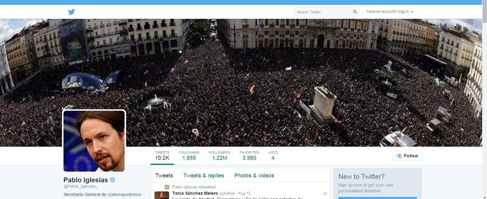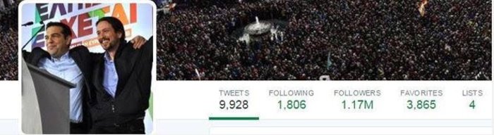 Ο επικεφαλής των Podemos κ. Πάμπλο Ιγκλέσιας προχώρησε σε μια συμβολική μάλλον κίνηση: Μετά την υπογραφή του τρίτου Μνημονίου κατέβασε την κοινή του φωτογραφία με τον Έλληνα Πρωθυπουργό – και φόντο το σύνθημα «Η Ελπίδα έρχεται»- από τον επίσημο λογαριασμό του στο twitter.