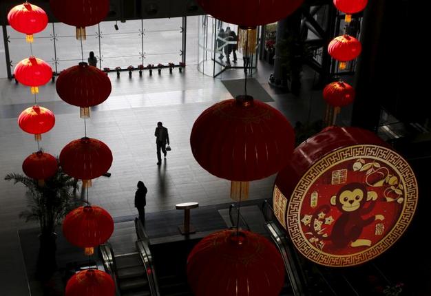 Μεγάλα παραδοσιακά φανάρια και μια πινακίδα εορτασμού της επερχόμενης νέας χρονιάς του πιθήκου είναι εγκατεστημένα σε ένα εμπορικό κτίριο στο Πεκίνο, στις 26 Ιανουαρίου 2016. KIM KYUNG-HOON / REUTERS