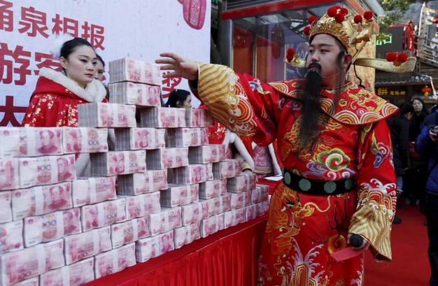 Ένας άνδρας ντυμένος σαν Κινέζος θεός της τύχης προσπαθεί να φτάσει μια δέσμη τραπεζογραμματίων των 100 γιουάν κατά την διάρκεια εκδήλωσης που πραγματοποιήθηκε για τον εορτασμό του επερχόμενου Εαρινού Φεστιβάλ, σε ένα πάρκο στην Hangzhou, στην επαρχία Zhejiang, στις 26 Ιανουαρίου 2016. REUTERS