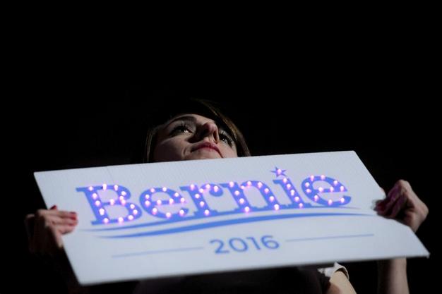 Ένας υποστηρικτής του Δημοκρατικού προεδρικού υποψηφίου των ΗΠΑ Bernie Sanders κρατά μια πινακίδα καθώς ακούει στην κεντρική αίθουσα στο Πανεπιστήμιο της Βόρειας Αϊόβα στο Cedar Falls, στις 24 Ιανουαρίου 2016. MARK KAUZLARICH / REUTERS