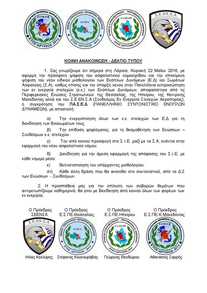 Στη Λάρισα, Κυριακή 22 Μαΐου 2016, με αφορμή την πρόσφατη ψήφιση του ασφαλιστικού νομοσχεδίου και την επικείμενη ψήφιση του νέου ειδικού μισθολογίου των Ενόπλων Δυνάμεων (Ε.Δ) και Σωμάτων Ασφαλείας (Σ.Α), καθώς επίσης και την ύπαρξη κενού στην Πανελλήνια εκπροσώπηση των εν ενεργεία στελεχών (ε.ε.) των Ενόπλων Δυνάμεων, αποφασίστηκε από τις Περιφερειακές Ενώσεις Στρατιωτικών της Θεσσαλίας, της Ηπείρου, της Κεντρικής Μακεδονίας αλλά και του Σ.Ε.ΕΝ.Σ.Α (Σύνδεσμος Εν Ενεργεία Στελεχών Αεροπορίας), η συγκρότηση του ΠΑ.Σ.Ε.Δ (ΠΑΝΕΛΛΗΝΙΟ ΣΥΝΤΟΝΙΣΤΙΚΟ ΕΝΟΠΛΩΝ ΔΥΝΑΜΕΩΝ), με αποστολή: