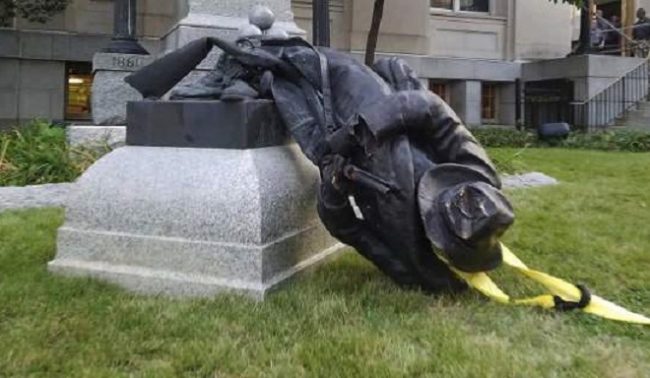 Φωνάζοντας «Όχι στην Κου Κλουξ Κλαν, όχι φασιστικές ΗΠΑ» οι διαδηλωτές πέρασαν ένα σκοινί γύρω απ’ το λαιμό ενός αγάλματος που αναπαριστά έναν στρατιώτη των Νοτίων και άρχισαν να τραβούν.