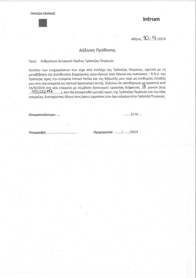 Η Τράπεζα Πειραιώς ζητά από εργαζόμενους να υπογράψουν «δήλωση πρόθεσης», με την οποία αποδέχονται να δουλέψουν «στη εταιρεία Intrum Hellas» με «σύμβαση δανεισμού», διάρκειας από τρεις έως και εννέα μήνες.
