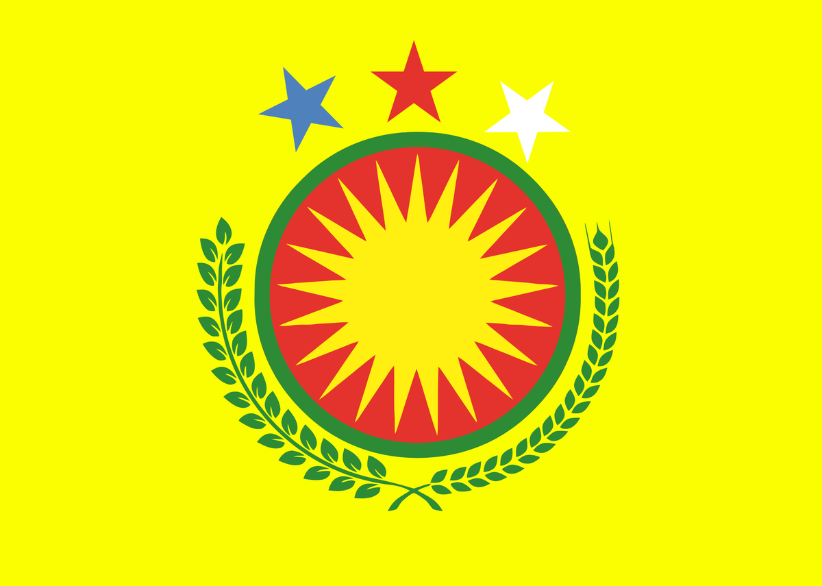 Η σημαία της Ροζάβα με τον ήλιο στη μέση και τα χρώματα των Κούρδων, πράσινο – κόκκινο – κίτρινο, και τα τρία αστέρια που συμβολίζουν τα τρία Καντόνια.
