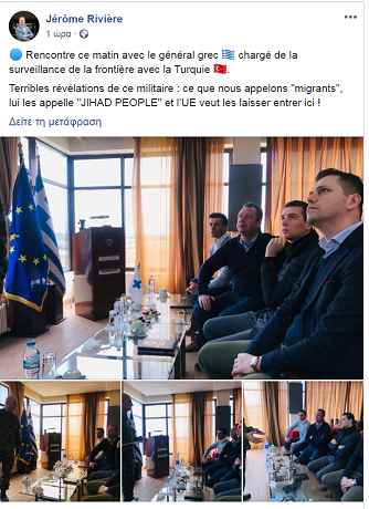 Σύμφωνα με τις φωτογραφίες και τις λεζάντες στις αναρτήσεις τους (ενδεικτικά δείτε την κεντρική μας φωτογραφία δεξιά) έλαβαν ενημέρωση από εκπροσώπους του ελληνικού στρατού. Μάλιστα, όπως γράφει ο ευρωβουλευτής, Ζερόμ Ριβιέρ, συναντήθηκαν με αξιωματικούς του ελληνικού στρατού, υπευθύνων για την επιτήρηση των συνόρων με την Τουρκία, κι ότι ένας από αυτούς έκανε λόγο για τζιχαντιστές μετανάστες:
