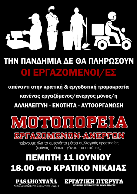 Μια μεγάλη επιχείρηση αστυνομικής τρομοκρατίας και ωμής καταπάτησης των δημοκρατικών δικαιωμάτων των εργαζομένων, εκτυλίχθηκε στο βράδυ της Πέμπτης 11/6 στην Αγία Βαρβάρα – Αιγάλεω. Δεκάδες αστυνομικές μοτοσυκλέτες, ΔΙΑΣ και ΔΕΛΤΑ (Δράση), περιπολικά και άλλες δυνάμεις περικύκλωσαν την μοτοπορεία για τα εργατικά και εργασιακά δικαιώματα που οργάνωνε το στέκι Πασαμοντάνια του Κορυδαλλού, με συμμετοχή του σωματείου βάσης ΣΒΕΟΔ και άλλων συλλογικοτήτων.