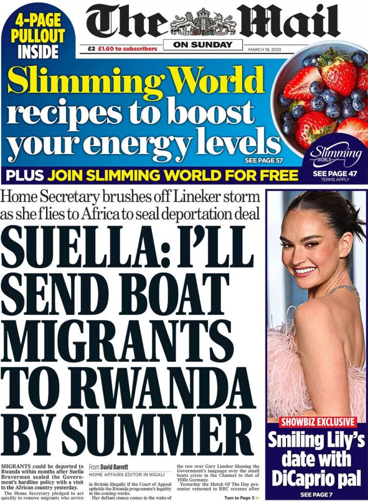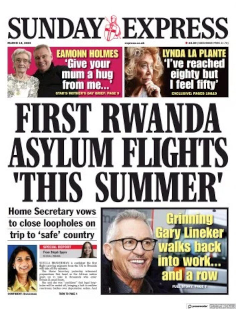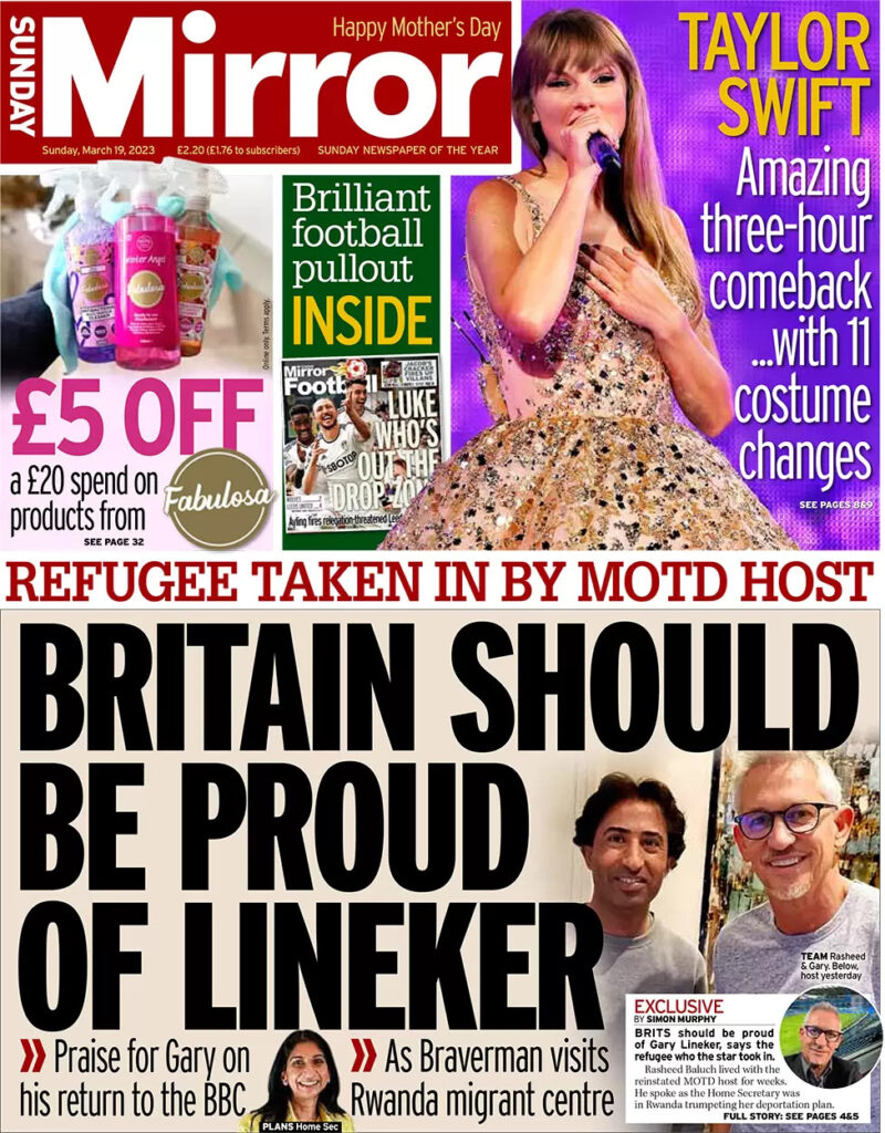 Η Sunday Mirror σημειώνει ότι το ταξίδι της Braverman στη Ρουάντα συνέπεσε με την επιστροφή του Gary Lineker στο Match of the Day στο BBC, μετά από διαμάχη σχετικά με την κριτική του για τη μεταναστευτική πολιτική της κυβέρνησης. Περιλαμβάνει επίσης μια συνέντευξη του πρόσφυγα Rasheed Baluch που έζησε με τον παρουσιαστή για εβδομάδες, ο οποίος δηλώνει στην εφημερίδα: «Η Βρετανία πρέπει να είναι περήφανη για τον Lineker».