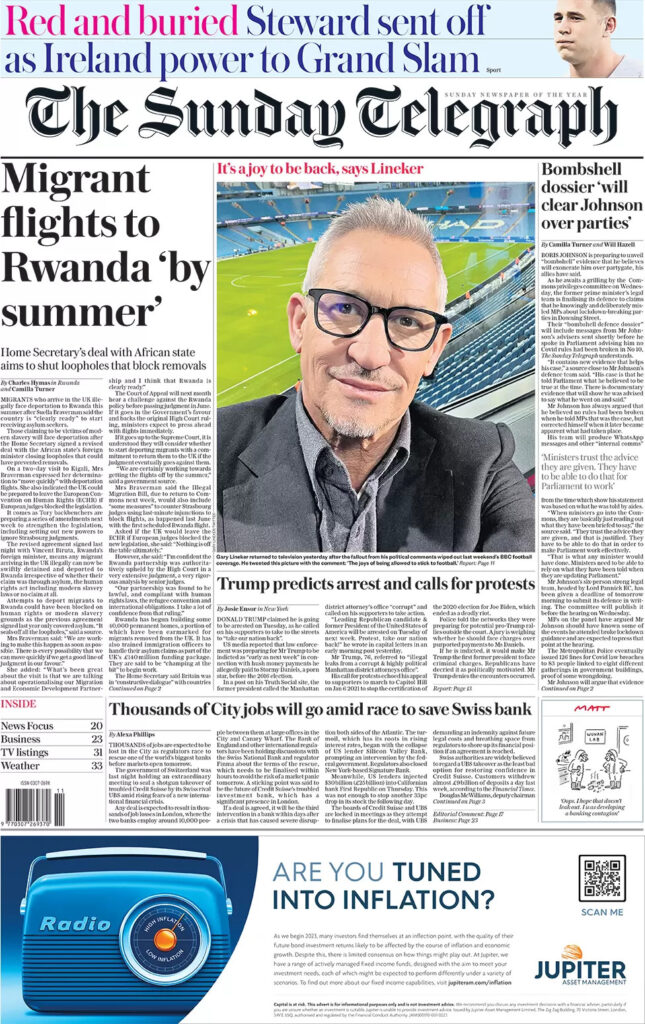Η κ. Braverman είπε ότι η Ρουάντα είναι «σαφώς έτοιμη» να αρχίσει να δέχεται αιτούντες άσυλο, γράφει και η Sunday Telegraph, η οποία σημειώνει ότι κατά τη διάρκεια της διήμερης επίσκεψής της στη Ρουάντα, η υπουργός Εσωτερικών εξέφρασε την αποφασιστικότητά της να «κινήσει γρήγορα» τις διαδικασίες με πτήσεις απέλασης. Η εφημερίδα δημοσιεύει μια φωτογραφία του παρουσιαστή Gary Lineker, ο οποίος επέστρεψε στην τηλεόραση το Σάββατο μετά από μια διαμάχη του με το BBC, εξαιτίας κάποιον αναρτήσεων του στο tweeter που επέκριναν την πολιτική ασύλου της κυβέρνησης. Γράφει και για την κούρσα για τη διάσωση της προβληματικής τράπεζας Credit Suisse και προειδοποιεί ότι χιλιάδες θέσεις εργασίας αναμένεται να χαθούν, ως αποτέλεσμα της συμφωνίας, ενώ η κυβέρνηση της Ελβετίας ετοιμάζεται να χρησιμοποιήσει έκτακτα μέτρα για να επισφραγίσει τη συμφωνία.