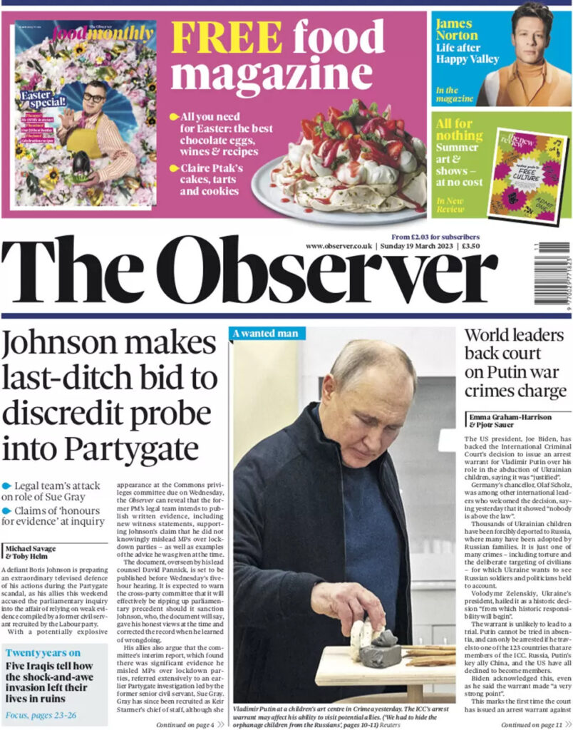 Ο Observer γράφει ότι ένας προκλητικός Μπόρις Τζόνσον ετοιμάζεται να υπερασπιστεί τις ενέργειές του κατά τη διάρκεια του σκανδάλου Partygate την Τετάρτη. Η νομική ομάδα του πρώην πρωθυπουργού σχεδιάζει να δημοσιεύσει γραπτά αποδεικτικά στοιχεία, συμπεριλαμβανομένων νέων καταθέσεων μαρτύρων, που θα υποστηρίξουν τον ισχυρισμό του κ. Τζόνσον ότι δεν παραπλάνησε εν γνώσει του τους βουλευτές σχετικά με τα πάρτι που έγιναν την περίοδο της καραντίνας. Ο Observer αποκαλεί τον πρώην πρωθυπουργό «προκλητικό» και αναφέρει ότι το έγγραφο θα δημοσιευτεί πριν από την εμφάνιση του Τζόνσον στην επιτροπή προνομίων των Κοινοτήτων την Τετάρτη, ενώ χαρακτηρίζει την εμφάνιση του ως «δυνητικά εκρηκτική». Επίσης σε άλλο πρωτοσέλιδο άρθρο της, η εφημερίδα σχολιάζει ότι ηγέτες όπως ο πρόεδρος των ΗΠΑ, Τζο Μπάιντεν, υποστηρίζουν την απόφαση του Διεθνούς Ποινικού Δικαστηρίου να εκδώσει ένταλμα σύλληψης για τον Βλαντιμίρ Πούτιν για εγκλήματα πολέμου, λέγοντας ότι ήταν «δικαιολογημένη», ενώ και ο καγκελάριος της Γερμανίας, Olaf Scholz, ήταν μεταξύ άλλων διεθνών ηγετών που χαιρέτησαν την απόφαση, λέγοντας χθες ότι «κανείς δεν είναι υπεράνω του νόμου». Αυτή είναι η πρώτη φορά που το δικαστήριο εκδίδει ένταλμα σύλληψης κατά του αρχηγού ενός από τα πέντε μόνιμα μέλη του Συμβουλίου Ασφαλείας του ΟΗΕ. Το ένταλμα ωστόσο είναι απίθανο να οδηγήσει σε δίκη, ο Πούτιν δεν μπορεί να δικαστεί ερήμην και μπορεί να συλληφθεί μόνο εάν ταξιδέψει σε μία από τις 123 χώρες που είναι μέλη του Διεθνούς Ποινικού Δικαστηρίου. Η Ρωσία, ο βασικός σύμμαχος του Πούτιν Κίνα, όπως και οι ΗΠΑ αρνήθηκαν να γίνουν μέλη του. Ο Πούτιν θα χαρακτηρίζεται πλέον ως φερόμενος εγκληματίας πολέμου για το υπόλοιπο της ζωής του και το δικαστήριο που είναι υπεύθυνο για τη διερεύνηση ορισμένων από τις πιο σοβαρές παραβιάσεις των τελευταίων δεκαετιών, τον τοποθετεί στην ίδια κατηγορία με διαβόητες προσωπικότητες όπως τον Σλόμπονταν Μιλόσεβιτς, πρώην πρόεδρο της Γιουγκοσλαβίας και τον πρώην δικτάτορα του Σουδάν, Ομάρ αλ Μπασίρ.