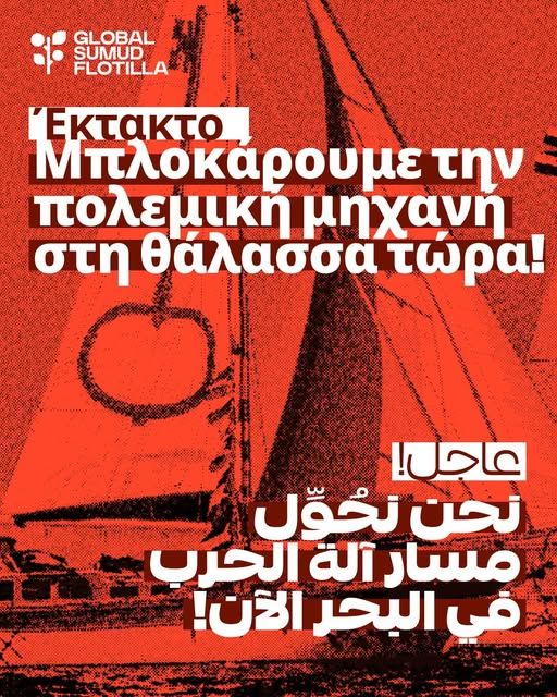Σήμερα, 20 Απριλίου, 13 σκάφη από το Global Sumud Flotilla πραγματοποιούν άμεση δράση, συντονίζοντας μια επιχείρηση παρεμπόδισης της παράνομης ροής όπλων προς το Ισραήλ, καθώς συνεχίζεται η γενοκτονία κατά των Παλαιστινίων.