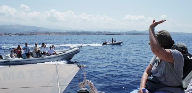 2 πλοιάρια ξεκίνησαν στις 14.45 από το Παλιό Λιμάνι στα Χανιά, από το ύψος του Λιμεναρχείου και άλλο ένα ξεκίνησε από την Παλιόχωρα. Θα συναντηθούν στα ανοικτά της θάλασσας για να πλεύσουν μετά μαζί στην προσπάθειά τους να εντοπίσουν και να σταματήσουν τη διαδικασία της υδρόλυσης εν πλω. Θα τα καταφέρουν; Άγνωστο.