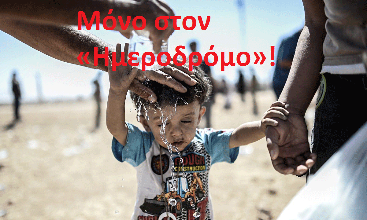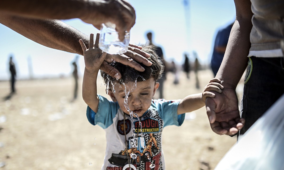 Κούρδος από τη Συρία δροσίζει τον μικρό πρόσφυγα που μόλις πέρασε τα σύνορα Συρίας – Τουρκίας, κοντά στη πόλη Suruc στην επαρχία Sanliurfa της ΝΑ Τουρκίας. 20 Σεπτέμβρη 2014