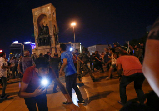Στην πλατεία Ταξίμ, στην Κωνσταντινούπολη, ο κόσμος που αντιτίθεται στο πραξικόπημα κατέβηκε στους δρόμους και με ότι βρήκε εύκαιρο προσπάθησε να σταματήσει τα άρματα.