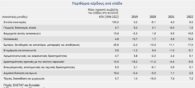 Πιο συγκεκριμένα, υπήρξε σχεδόν καθολική απόσυρση των μέτρων στήριξης έναντι της πανδημίας και απόσυρση της πλειονότητας των ενεργειακών μέτρων στήριξης, καθώς οι τιμές της ενέργειας αποκλιμακώθηκαν σημαντικά. Κατά συνέπεια, το εννεάμηνο του 2023 το μερίδιο καθαρού κέρδους (που ορίζεται ως ο λόγος του καθαρού λειτουργικού πλεονάσματος προς την καθαρή προστιθέμενη αξία), το οποίο εκφράζει την απόδοση του επιχειρηματικού τομέα σε όρους λειτουργικών κερδών, υποχώρησε σε 37,7% έναντι 41,4% την αντίστοιχη περίοδο του 2022. Εντούτοις, παρέμεινε εντυπωσιακά υψηλότερο από το μέσο όρο της προ της πανδημίας τριετίας 2017-2019 (28,1%). Οι καλές επιδόσεις του τουριστικού και του κατασκευαστικού τομέα, συνδυαστικά με τις πληθωριστικές πιέσεις και προσδοκίες και τη διατήρηση της ζήτησης σε θετικούς ρυθμούς, τροφοδότησαν τα τελευταία έτη την εξαιρετική πορεία των κερδών των επιχειρήσεων.»